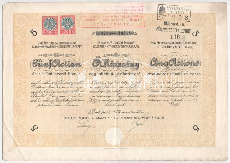 Leírás: Budapest 1923. "Urikány-Zsilvölgyi Magyar Kőszénbánya-Részvénytársaság" 5 + 10 részvénye egyenként 5000K-ról szelvényekkel, szárazpecséttel, felülbélyegzésekkel T:F