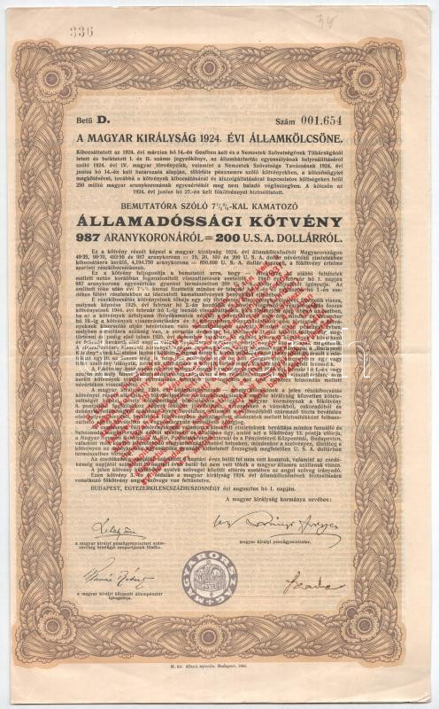 Budapest 1924. "A Magyar Királyság 1924. évi Államkölcsöne" 7 1/2%-kal kamatozó államadóssági kötvénye (2x), 987K-ról magyar nyelven + 1000Fr-ról francia nyelven, bélyegzéssel T:F