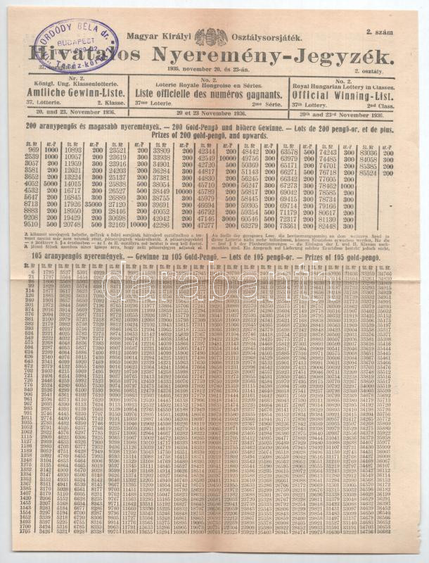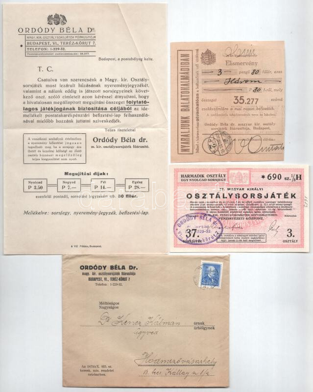 Budapest 1936. "37. Magyar Királyi Osztálysorsjáték" 1/8 sorsjegy, harmadik osztály, bélyegzéssel, "Ordódy Béla Dr." borítékkal, levéllel, elismervénnyel, nyeremény-jegyzékkel T:AU