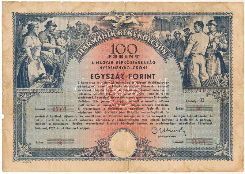 Leírás: Budapest 1952. "Harmadik Békekölcsön - II. osztály" sorsjegy 100Ft-ról, szárazpecséttel T:F,VG hibajavítózva
