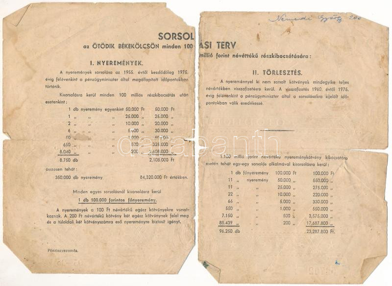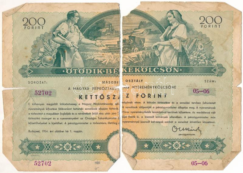 Leírás: Budapest 1954. "Ötödik Békekölcsön - Második osztály" sorsjegy 200Ft-ról szárazpecséttel T:Pr kettészakadva