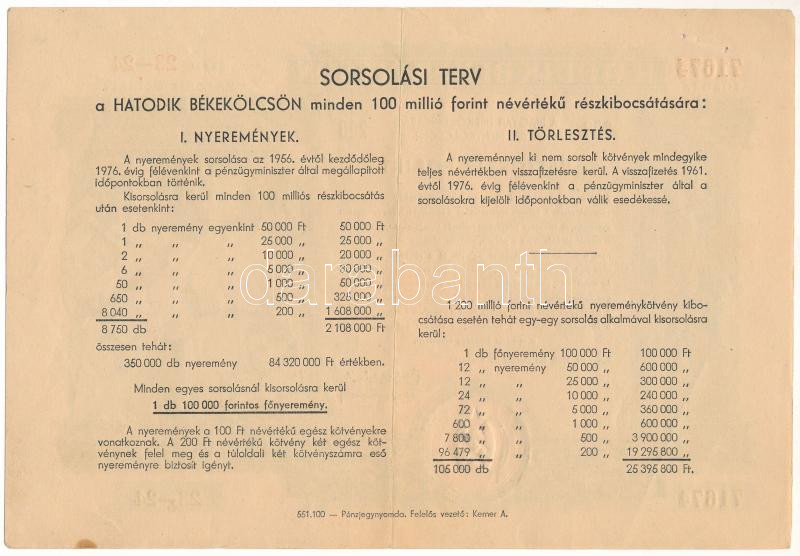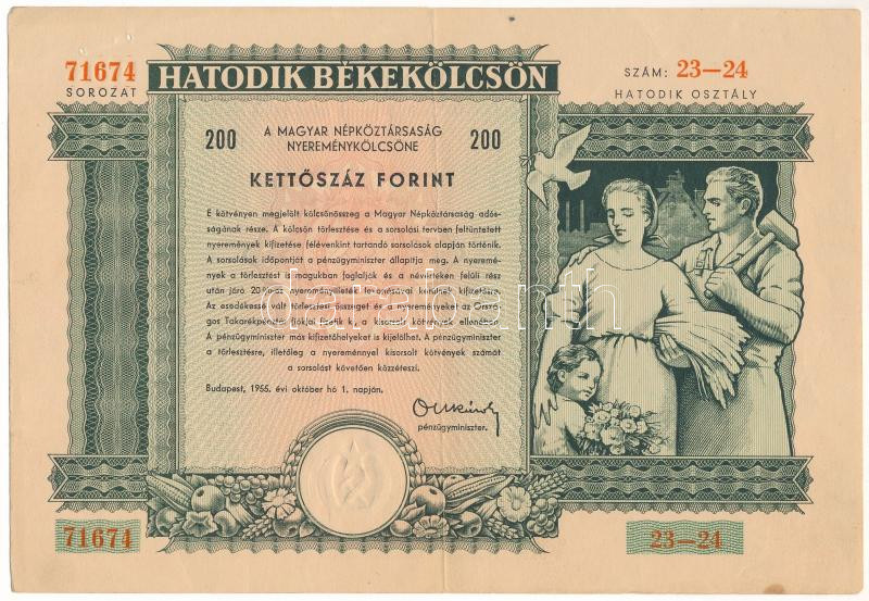 Leírás: Budapest 1955. "Hatodik Békekölcsön - Hatodik Osztály" nyereménykötvénye 200Ft értékben, szárazpecséttel T:F