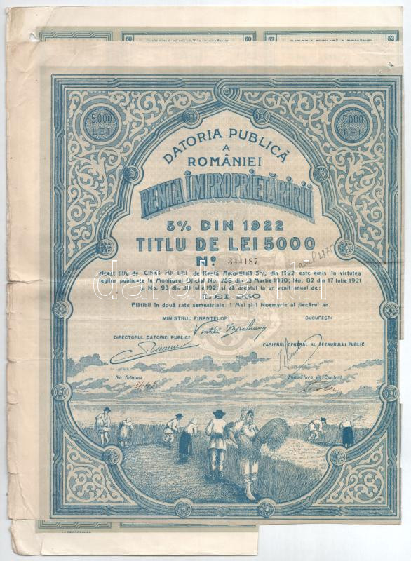 Románia / Bukarest 1922. "Renta Improperietaririi" 5%-os ing... https://www.darabanth.com/hu/475-Gyorsarveres/475.0/Numizmatika/Reszvenyek-es-sorsjegyek~2000007/Romania-Bukarest-1922-Renta-Improperietaririi-5-os-ingatlankolcson-kotveny-5000L-rol-TF~II3231677