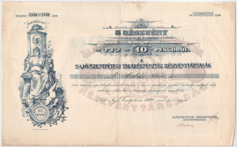 Sajószentpéter 1927. "Sajószentpéteri Takarékpénztár Részvénytárs... https://www.darabanth.com/hu/475-Gyorsarveres/475.0/Numizmatika/Reszvenyek-es-sorsjegyek~2000007/Sajoszentpeter-1927-Sajoszentpeteri-Takarekpenztar-Reszvenytarsasag-reszvenye-10P-rC5~II3137023