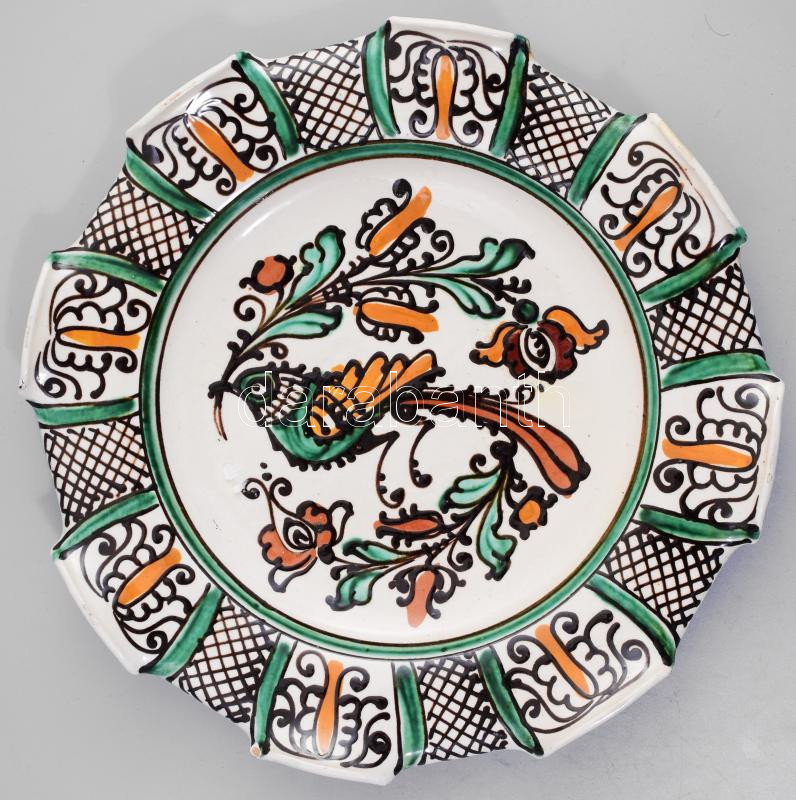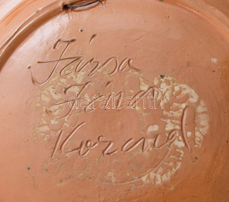Leírás: Józsa János Korond, madaras falitál, kézzel festett mázas cserép , jelzett, minimális lepattanással, d: 28 cm