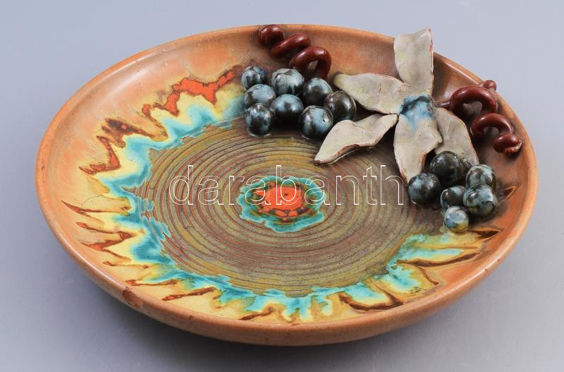 Leírás: Komlós gyümölcsös tál, plasztikus gyümölcs díszítményekkel, sérüléssel, d: 27 cm