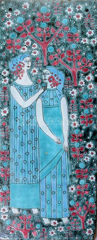 Leírás: Vén Edit (1937-): Lányok. Mázas kerámia, jelzett a hátoldalán, sarkán sérült, 36x14 cm