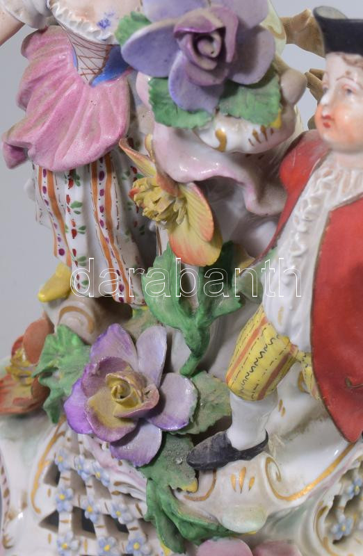 Leírás: Antik drezdai porcelán figurális gyertyatartó, jelzett, sérült, hiányos, m: 28,5 cm