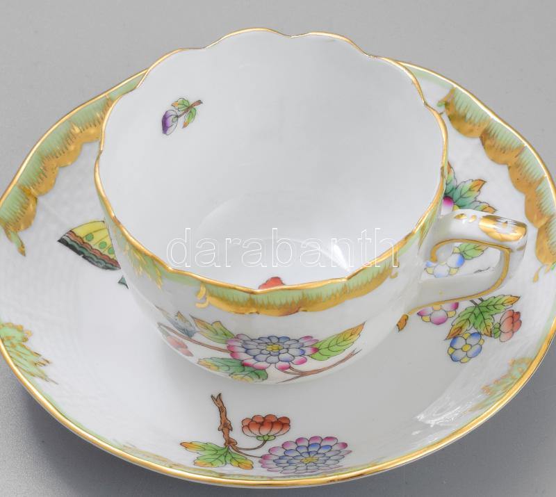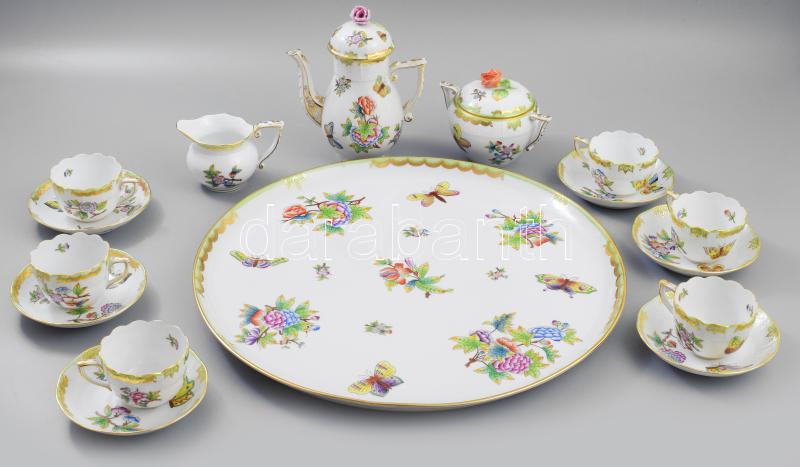 Leírás: Herendi Viktória mintás, mokkás készlet. Hat személyes, teljes, plusz egy nagy tálca d: 40 cm. Kézzel festett, jelzett, minimális kopással.