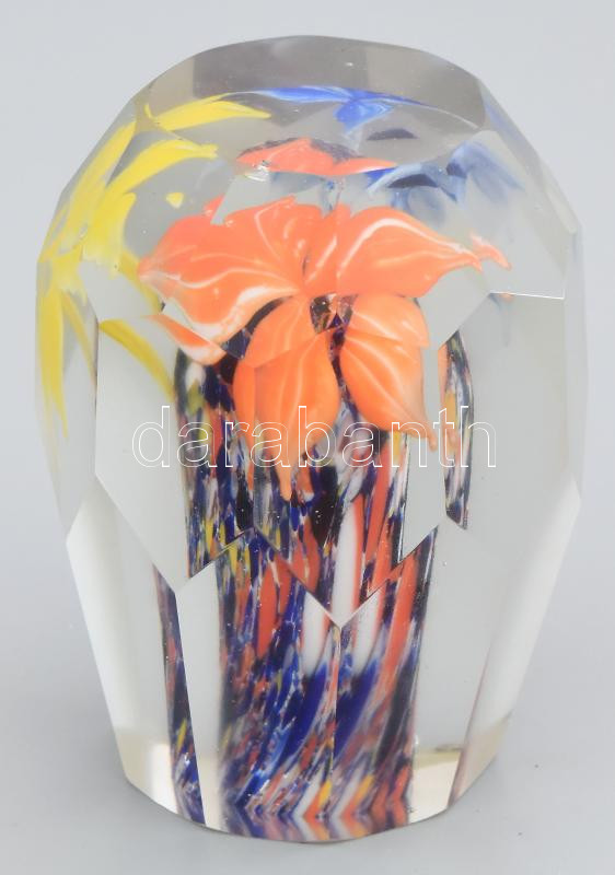 Bohemia levélnehezék. Öntött üveg, beleolvasztott virág felépítménnyel, ékkőszerűen fazettált, jelzés nélkül, cca 20. sz. első fele, kis pattogzással, m: 9 cm