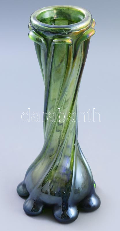 Cseh fémlüszteres csavart hutaüveg iparművész váza, jelzés nélkül, m: ... https://www.darabanth.com/hu/475-Gyorsarveres/475.0/Porcelan-keramia-uveg/Uvegtargyak~500008/Cseh-femluszteres-csavart-hutauveg-iparmuvesz-vaza-jelzes-nelkul-m-19-cm~II3222993