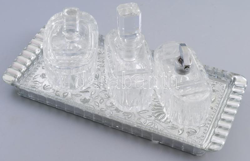 Leírás: Kristály háromrészes pipere készlet, ezüstözött tálcán, 34x16 cm