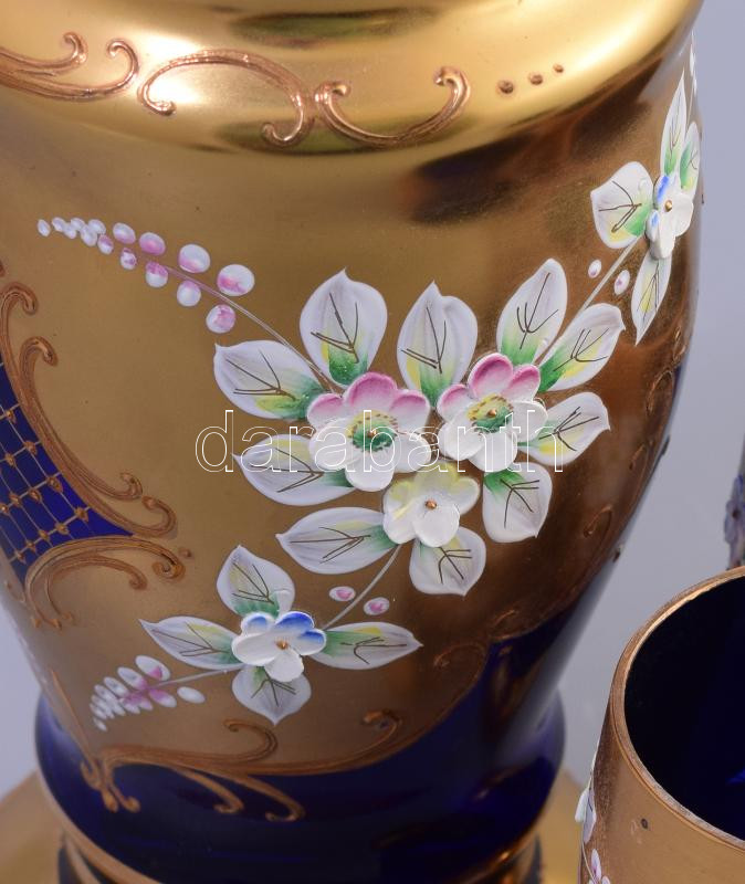 Leírás: Vizes kancsó hat pohárral. Kézzel festett, formába öntött üveg. Plasztikus virág díszítéssel, aranyozott. Kancsó 30 cm
