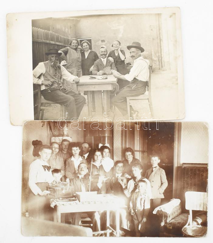 Leírás: cca 1920/40, 2 darab fotólap mulatozó társaságról, 8,5x13 cm, 8,5x14 cm