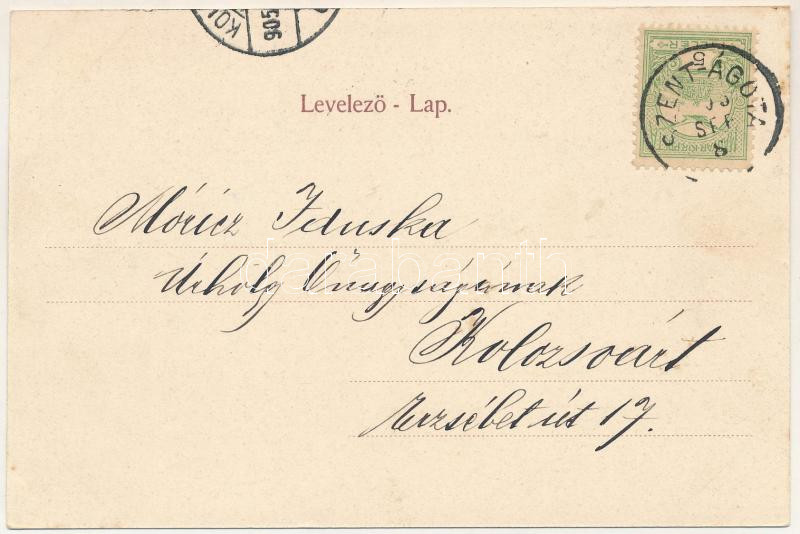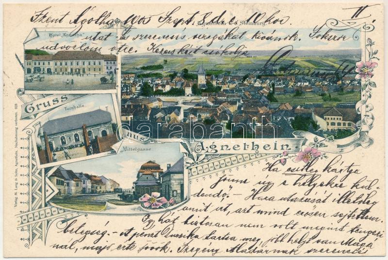 1905 Szentágota, Agnetheln, Agnita; Hotel Agnetha, Agnetheln v. d. Steinburg, Turnhalle, Mittelgasse / szálloda, látkép, tornaterem, Közép utca. M. Lang és Fia kiadása / hotel, general view, gym, street view. Art Nouveau, floral