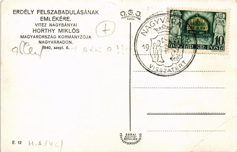 Leírás: 1940 Nagyvárad, Oradea; bevonulás, Horthy Miklós / entry of the Hungarian troops, Regent Horthy + "1940 Nagyvárad visszatért" So. Stpl. (EB)
