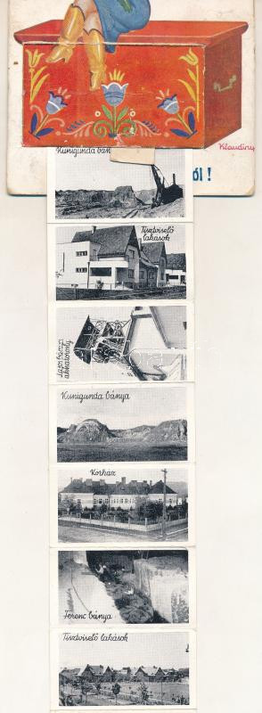 1940 Aknaszlatina, Akna Slatina, Slatinské Doly, Szolotvino, Solotvyno; magyar népviseletes leporellólap 10 kis képpel, közte kórház, bányák, stb. / Hungarian folklore leporellocard with 10 small pictures, including hospital, mines, etc. s: Klaudinyi (EK)