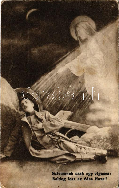 1915 Szívemnek csak egy vígasza: boldog lesz az édes Haza! / WWI Austro-Hungarian K.u.K. military art postcard, patriotic propaganda, dying soldier with angel (EK)