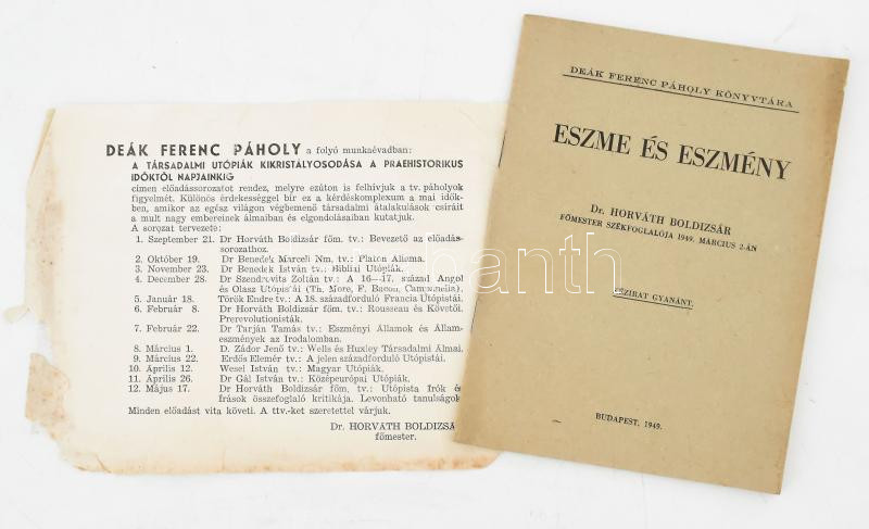 Eszme és eszmény. Dr. Horváth Boldizsár főmester székfoglalója 1949. március 2-án. Bp., 1949. Kiadói papírkötés, jó állapotban + A Deák Ferenc Páholy meghívója, szakadásokkal