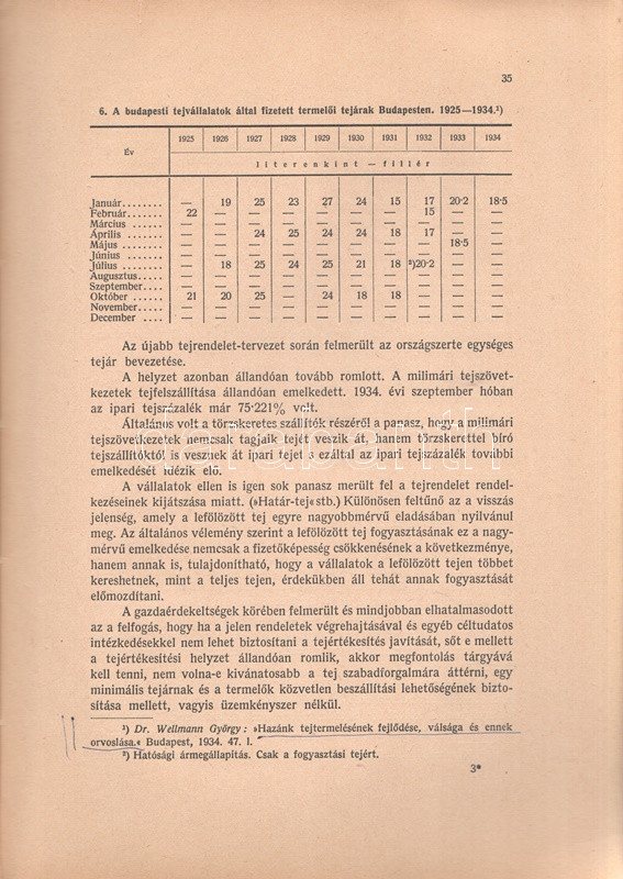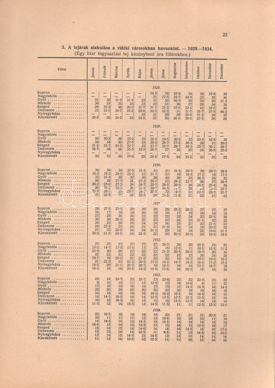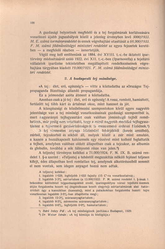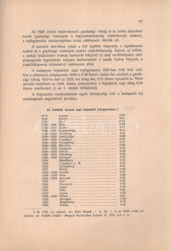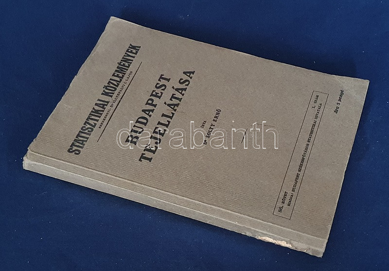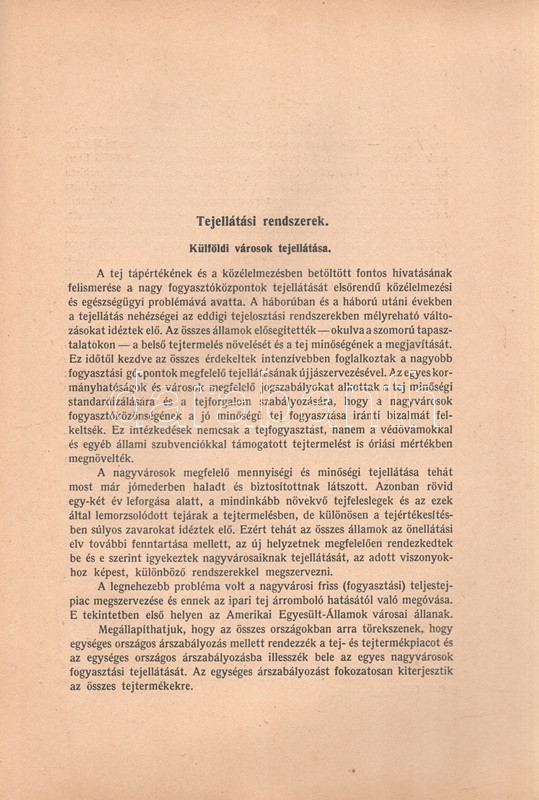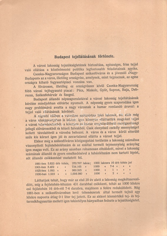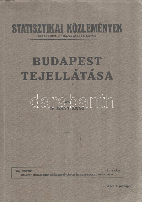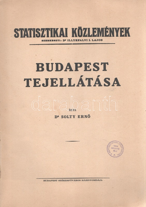 Solty Ernő: Budapest tejellátása. Budapest, [1938]. Budapest Székesfővárosi Statisztikai Hivatala (Székesfővárosi házinyomda). 160 p. Egyetlen kiadás. Solty Ernő (sz. 1904) statisztikus, miniszteri osztálytanácsos monográfia Budapest tejfogyasztásáról. A gazdag adatállományon nyugvó kötet vázolja Budapest tejfogyasztásának történetét, a tejszállítás szállítási módszereinek gyökeres átalakulását (túlnyomórészt vasúton, hűtött kocsikban érkezik, a gyalogos szállítás elhanyagolható), a tej és tejtermékek országon belüli markáns eltéréseit, a szabadversenyes kapitalizmus körülményei között a tejtermékek árainak éven belüli markáns változásait, a tejipar hatósági szabályozásának lassú erősödését. Kitekintéssel a külföldi tejfogyasztási szokásokra, illetve a tejpropaganda feladataira. A címoldalon régi gyűjteményi bélyegzés, az első ívek fűzése enyhén laza. (Statisztikai közlemények, 86. kötet, 1. szám.) BOEH VII: 1996. Fűzve, enyhén sérült gerincű kiadói borítóban. Jó példány.