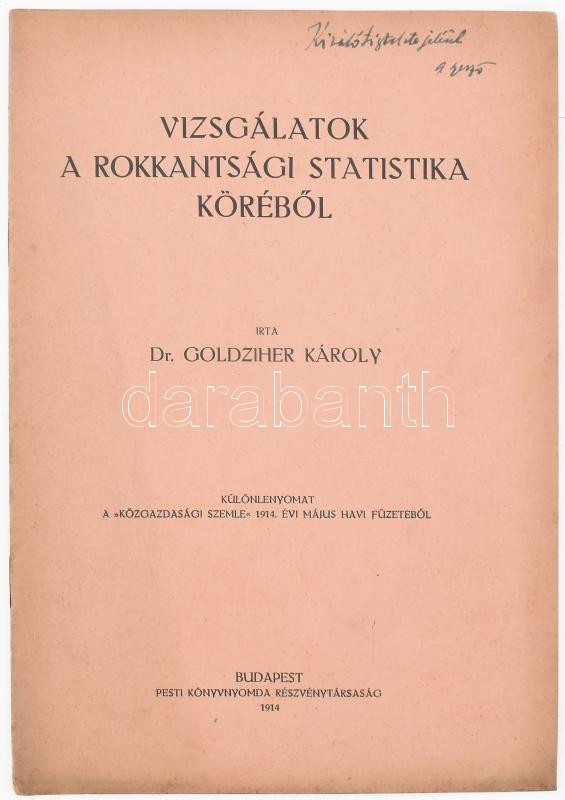 Goldzicher Károly: Vizsgálatok a rokkantsági statistika köréből. DEDIK... https://www.darabanth.com/hu/476-Gyorsarveres/476.0/Konyvek/Konyvek-Termeszettudomany-medicina~2000114/Goldzicher-Karoly-Vizsgalatok-a-rokkantsagi-statistika-korebol-DEDIKALT-Bp-1914-Pesti~II3241327