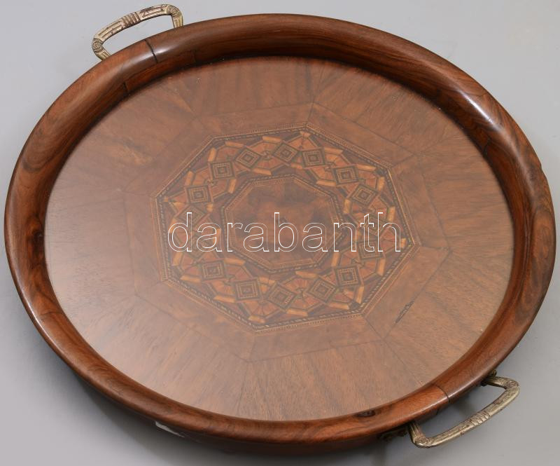 Leírás: Szecessziós intarziás tálca, d: 32,5 cm