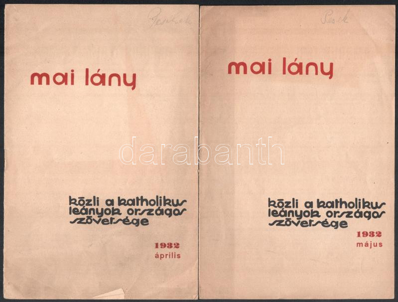 Leírás: 1932 Mai Lány c. lap A Katholikus Leányok Országos Szövetsége kiadása. 2 db szám április, május