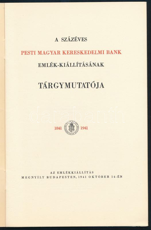 A százéves Pesti Magyar Kereskedelmi Bank emlék-kiállításának tárgymut... https://www.darabanth.com/hu/476-Gyorsarveres/476.0/Mutargy-papirregiseg-egyeb/Nyomtatvanyok~1500015/A-szazeves-Pesti-Magyar-Kereskedelmi-Bank-emlek-kiallitasanak-targymutatoja-Bp-1941-~II3240044