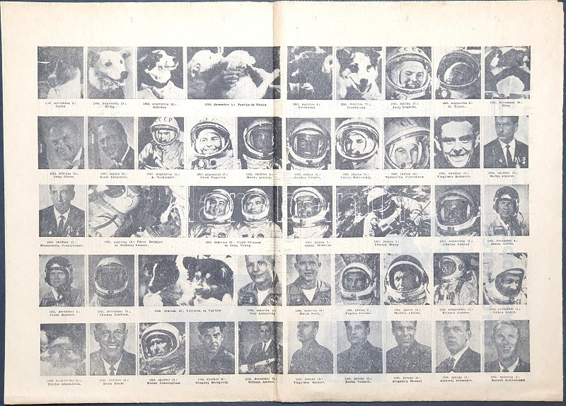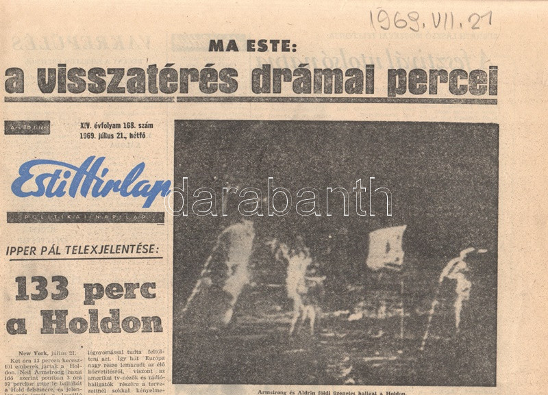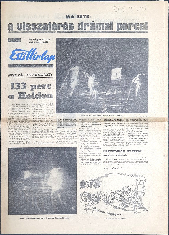 [Folyóirat] "133 perc a Holdon. Ma este: a visszatérés drámai percei". Az Esti Hírlap lapszáma az Apollo-11 expedíciójának Hold-sétájáról. (XIV. évfolyam, 168. szám, 1969. július 21.) Budapest, 1969. Szikra Lapnyomda. [8] p. Folio. A második világháborút követően jelentős fegyverkezési verseny kezdődött az Egyesült Államok és a Szovjetunió között. Ennek a versengésnek volt az eredménye a nyugati világot sokkoló Szputnyik-1 műhold fellövése 1957 októberében, melyet a szovjet hírközlés nagy diadallal jelentett be. Jóllehet a szovjetek által fellőtt első műhold nyomán kitört pánik egyebek között a NASA megalakulásához vezetett, 1961. április 12-én Jurij Gagarin másfél órás űrutazásával újabb szovjet diadal született. Mivel az amerikai űrprogram mind az első műhold, mind az első ember űrbe küldésével lemaradásba került. John F. Kennedy amerikai elnök csattanós válaszként 1961. május 25-én a szenátusban meghirdette a Holdra szállási programot. A később Apollo-projektként elhíresült terv szerint még az évtized vége előtt embert kell juttatni a Holdra, és sikeresen vissza is kell hozni onnan. A nagyívű terv sikeréhez azonban rengeteg részlet kidolgozásra szorult. Bár az 1961. május 5-én végrehajtott első amerikai űrutazással kiderült, hogy a kozmikus sebesség, a kozmikus sugárzás és a súlytalanság állapota is túlélhető az emberi szervezet számára, a következő űrutazások során még számtalan vezérlési, kommunikációs, tudományos és egészségügyi kihívásra kellett megoldást találni, illetve meg kellett oldani a Föld kerüli keringés, a hosszú távú űrben tartózkodás, az együttes repülés, az űrséta és az űrrandevú technikai kérdéseit. Az 1961-től kibontakozó Mercury- és Gemini-programok sikere után 1967-től indult a Hold-utazás végső szakaszának programja, az Apollo-program. A tragédiát sem nélkülöző űrprogram döntő része 1967-1969 között zajlott, melynek során az Apollo-űrhajók több alkalommal megközelítették a Holdat, körbe is fényképezték, és kezdettől fogva a két űreszközös megoldást választották, melynek értelmében a Föld-Hold-távolságot megtevő anyaűrhajó Hold körüli pályára áll, és onnan egy másik járművel, egy holdkomppal érik el a Hold felszínét, majd jutnak vissza onnan. Az Apollo-11 űrhajó 1969. július 16-án startolt Floridából, és több napnyi utazás, majd Hold körüli pályára állás után az anyaűrhajóról leválasztott holdkomp 1969. július 20-án, a vasárnap esti órákban érte el a Hold felszínét. Illusztrált beszámolónk a holdkompban tartózkodó két amerikai űrhajós, Neil Armstrong és Buzz Aldrin két órán át tartó holdsétáját ismerteti, különös módon kiemelve, hogy Neil Armstrong bal lábbal lépett a Holdra, illetve sejtetve a tényt, hogy Buzz Aldrin ugrálásaival szemben a bal lábával a Holdat érő Armstrong végig komoly maradt. A magyar kommentár némiképp nehezményezi az amerikai lobogó kitűzését is. Neil Armstrong elhíresült bonmot-ját - ,,Kis lépés az embernek, nagy lépés az emberiségnek - a beszámoló nem említi. A harmadik oldalon további anyag az expedícióról, annak súlyos költségeiről, a holdbéli gravitációról, az amerikai szórakoztatóipar kapcsolódó túlkapásairól. Az űrhajósok portréját és az általuk készített felvételeket is közlő lapszám kiemeli, hogy a világszerte közvetített holdséta feltehetően a világ eddigi legnézettebb adása volt. A véleményoldal kommentárja minden alkalmat megragad az amerikai eredmény szovjet kontextusba helyezésére, illetve költségeinek firtatására. A további oldalon magyar vonatkozású hírek, a záró oldalon az űrben járt valamennyi szovjet és amerikai űrutazó fényképe, Lajka kutyától Buzz Aldrinig, az űrbe lépés időpontja szerint. Jó állapotú lapszám.