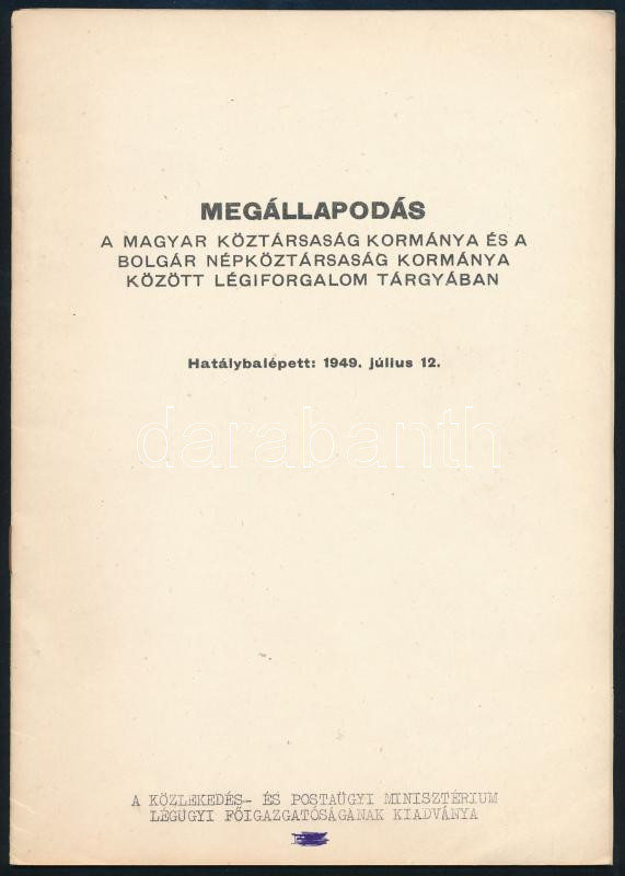 cca 1960-80 Megállapodás a Magyar Népköztársaság kormánya és a Bolgár Népköztársaság kormánya között légiforgalom tárgyában, hatálybalépett: 1949. július 12. Bp., Közdok. 6+4 p. Kiadói papírkötés, borítón tollas firkával.