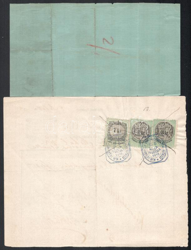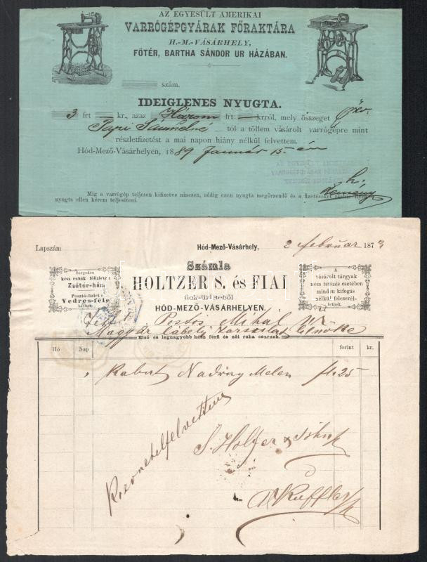 Leírás: 1879-1889 Hódmezővásárhely, 2db okmány: 1889 Egyesült Amerikai Varrógépgyára Főraktára nyugtája, díszes fejléces papíron, hajtásnyommal + 1879 Holtzer S. és Fiai, díszes fejléces papíron, hajtásnyommal, 7 kr és 2x3 kr okmánybélyegekkel, hódmezővásárhelyi árvaszéki bélyegzésekkel