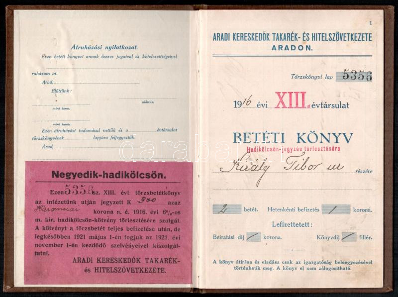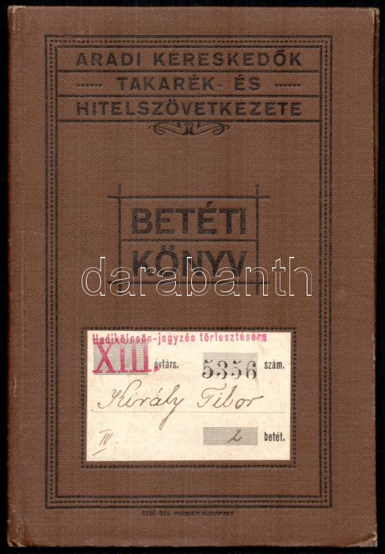 1916 Aradi Kereskedők Takarék- és Hitelszövetkezete betéti könyv hadik... https://www.darabanth.com/hu/476-Gyorsarveres/476.0/Mutargy-papirregiseg-egyeb/Okmanyok~500021/1916-Aradi-Kereskedok-Takarek-es-Hitelszovetkezete-beteti-konyv-hadikolcson-jegyzes-torlesztesere~II3238343