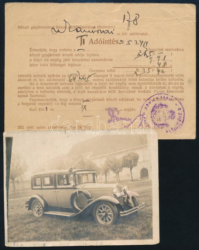 Leírás: 1931 Nagykanizsa, (II.) adóintés gépjármű közúti adója befizetésének tárgyában, 10f díjjeggyel, hozzá mellékelve az automobil fotója, 11,5x8,5 cm