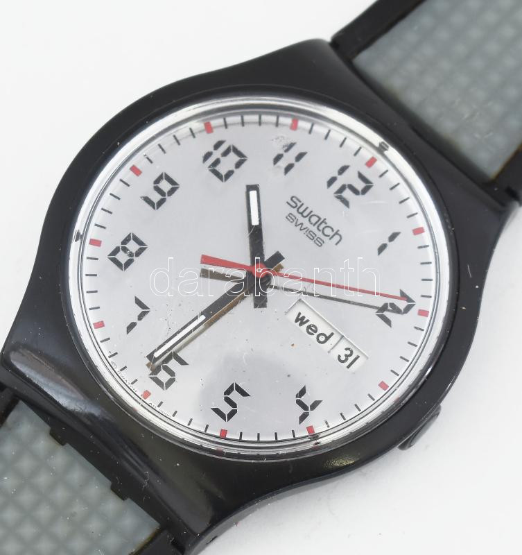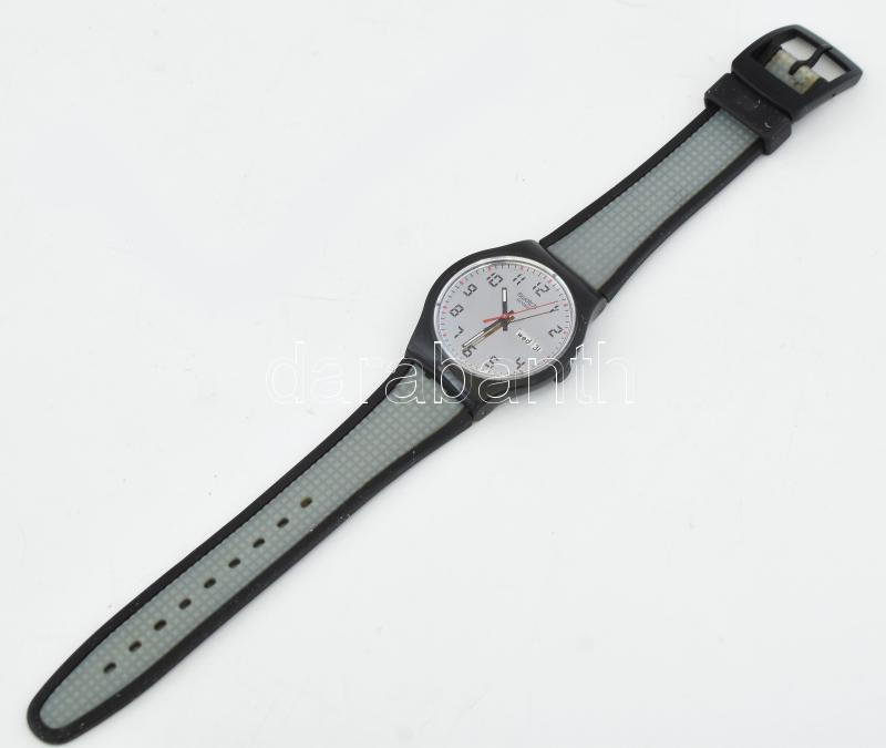 Leírás: Swatch kvarc karóra, kaucsuk szíjjal, új elemmel, működik d: 38 mm