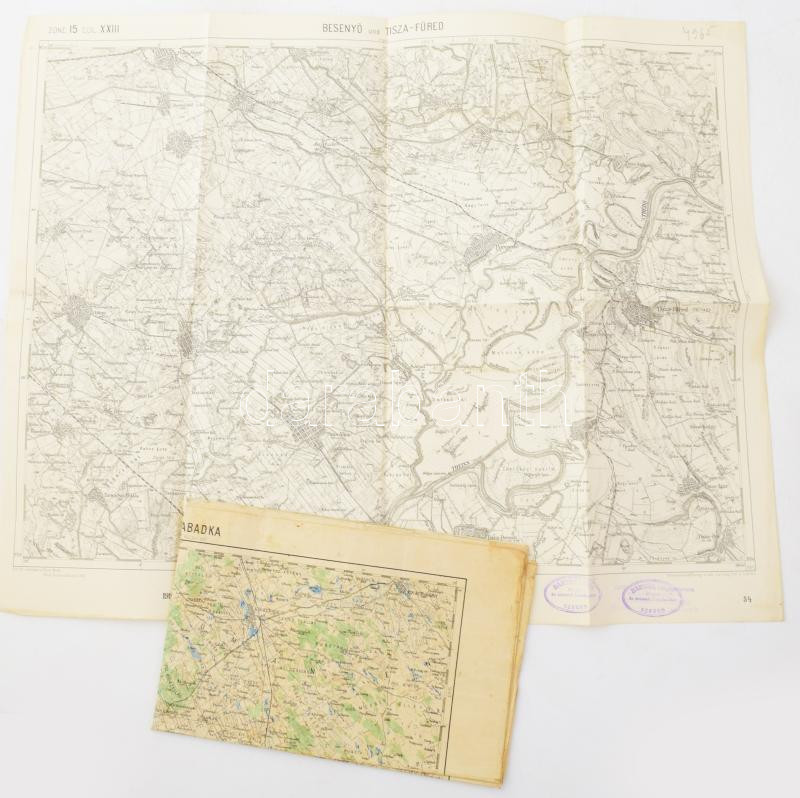 1927 Szabadka és környékének térképe, 1 : 200.000, M. Kir. Állami Térképező Intézet, kissé sérült, foltos, 61x47 cm + cca 1910 Besenyő és Tiszafüred környéke, katonai térkép, 1 : 75.000, K. u. k. militär-geographisches Institut, 43,5x54 cm