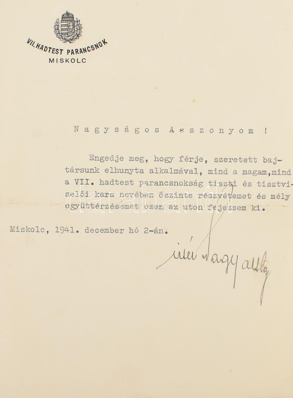 Leírás: 1941 A miskolci VII. hadtest parancsokának vitéz Nagy altábornagynak aláírása fejléces levélpapíron