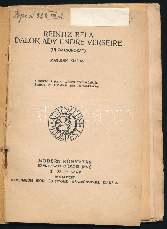 Reinitz Béla: Dalok Ady Endre verseire. (Új dalsorozat.) Modern Könyvtár. [Kotta.] Bp., 1920, Athenaeum, IV+1+33 p. Második kiadás. Modern, pótolt, fénymásolt papírkötésben, kissé sérült címlapon leragasztott bejegyzéssel.