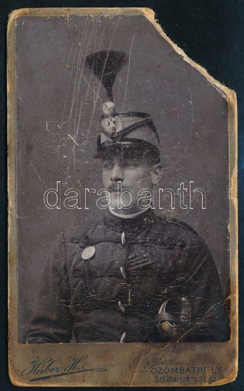 Leírás: cca 1900 Huszár portréja, keményhátú fotó Háber szombathelyi műterméből, sérült, 10,5×6,5 cm