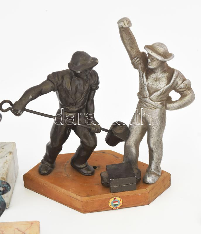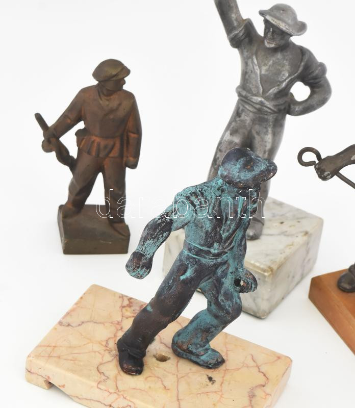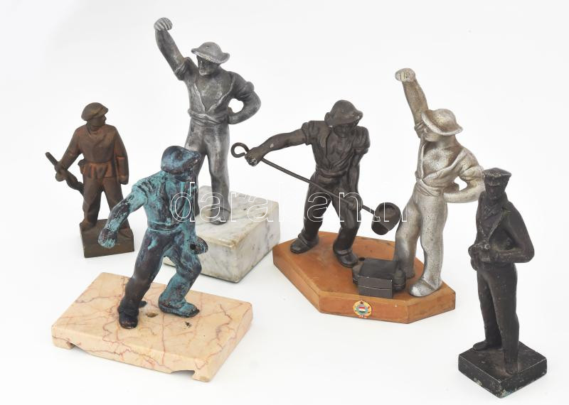 Leírás: 6 db szocreál szobor: munkásőr, öntőmunkás, katona, paraszt. Réz, fehér fém, stb 23 cm-ig