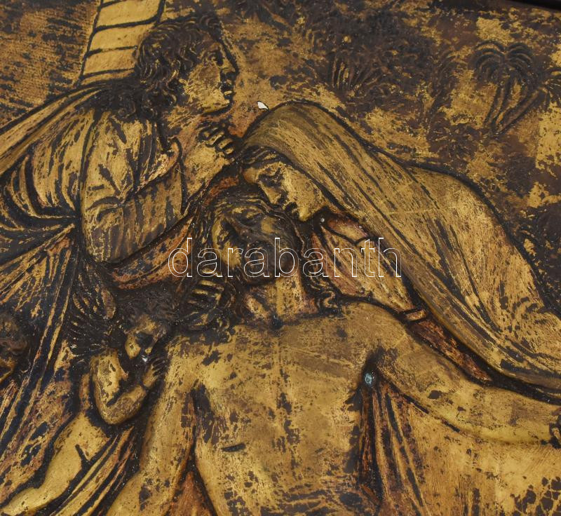 Leírás: Krisztus siratása. Antik fémlemez dombormű, fa keretben, 13x17 cm, kerettel 21x25 cm