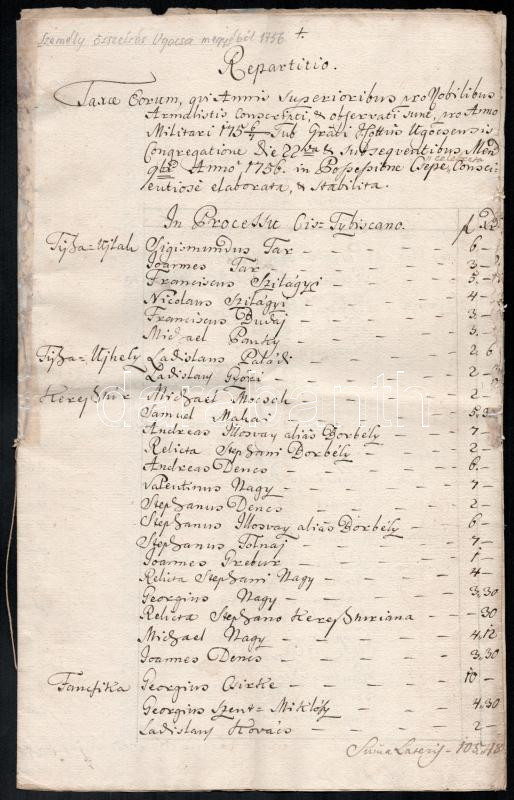 Leírás: 1756 Ugocsa megyei nemesek személyösszeírása. Repartitio. helyiségenkénti külön felsorolással. 6 beírt oldalon
