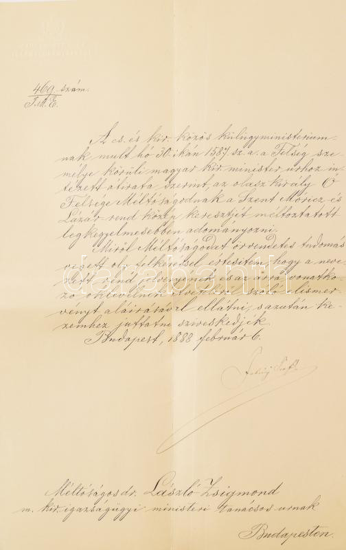 1888 Fabiny Teofil (1822-1908) jogász, igazságügy-miniszter autográf aláírása László Zsigmond (1845-1913) jogi doktor, igazságügyminiszteri tanácsos részére Szent Móricz és Lázár rend középkeresztjének adományozó okiratán.