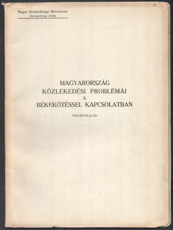 cca 1945 Magyarország közlekedési problémái a békekötéssel kapcsolatban. (Összefoglalás). Magyar Közlekedésügyi Minisztérium Üzemgazdasági osztály. A II. világháborút lezáró békeszerződés Magyarország közlekedésére vonatkozó következményeit tárgyaló gépirat, helyenként kézzel írt javításokkal, kiegészítésekkel. Tűzött papírkötés, sérült, a lapok többsége különvált a borítótól, (4)+51 p.