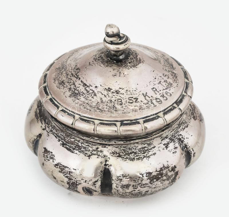 Leírás: Ezüst (Ag) bonbonier, "BSZKRTSE 1936" felirattal, jelzett, 83g