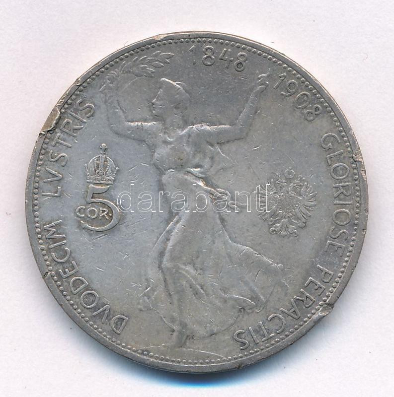 Austria 1908. 5 Corona Ag "Franz Joseph - Jubilee" C:F edge error, patina
