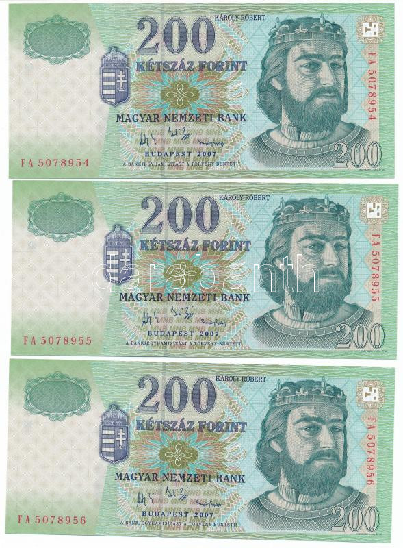 2007. 200Ft (3x) sorszámkövetők "FA 5078954 - FA 5078956" T:UNC https://www.darabanth.com/hu/476-Gyorsarveres/476.0/Numizmatika/Magyar-bankjegyek~1000007/2007-200Ft-3x-sorszamkovetok-FA-5078954-FA-5078956-T-UNC~II3232280