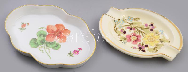Leírás: Herendi virágmintás ékszeres tál + Zsolnay virágmintás hamuzó, jelzett, h: 12-14 cm