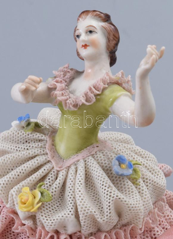 Leírás: Volkstedt tüll szoknyás táncos figura, jelzett, ragasztott, sérült, m: 13 cm