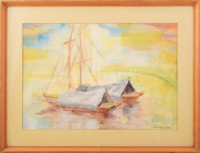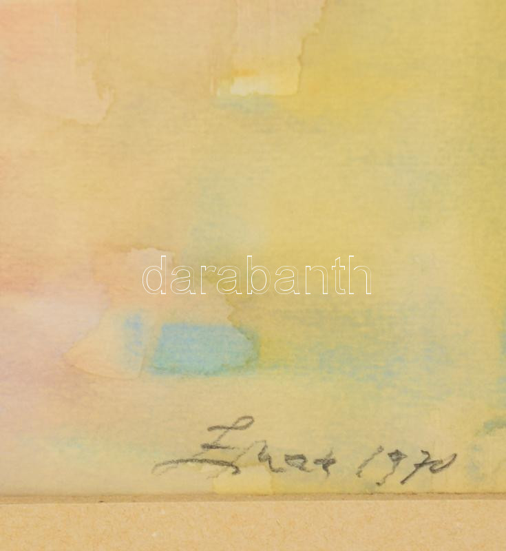 Leírás: Olvashatatlan jelzéssel: Balatoni fények, 1970. Akvarell, ceruza, papír, üvegezett fakeretben, 31,5×46 cm