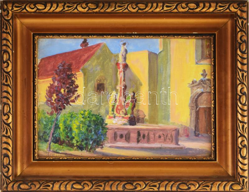 Olvashatatlan jelzéssel: Napos utca (Szeged?). Olaj, karton. 22,5x32 cm. Üvegezett fakeretben. keret hátoldalán Sándor Gyula szegedi képkeretező régi bélyegzőjével.